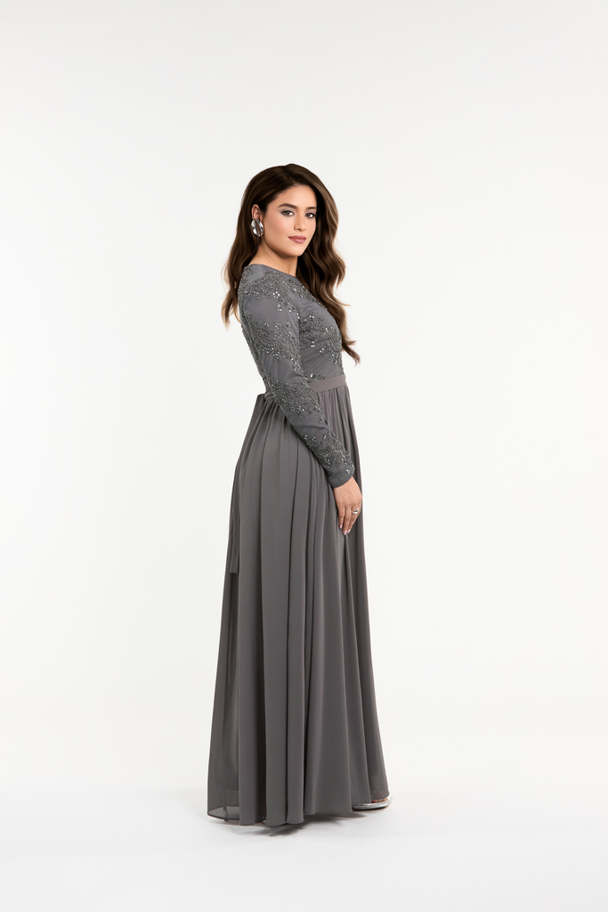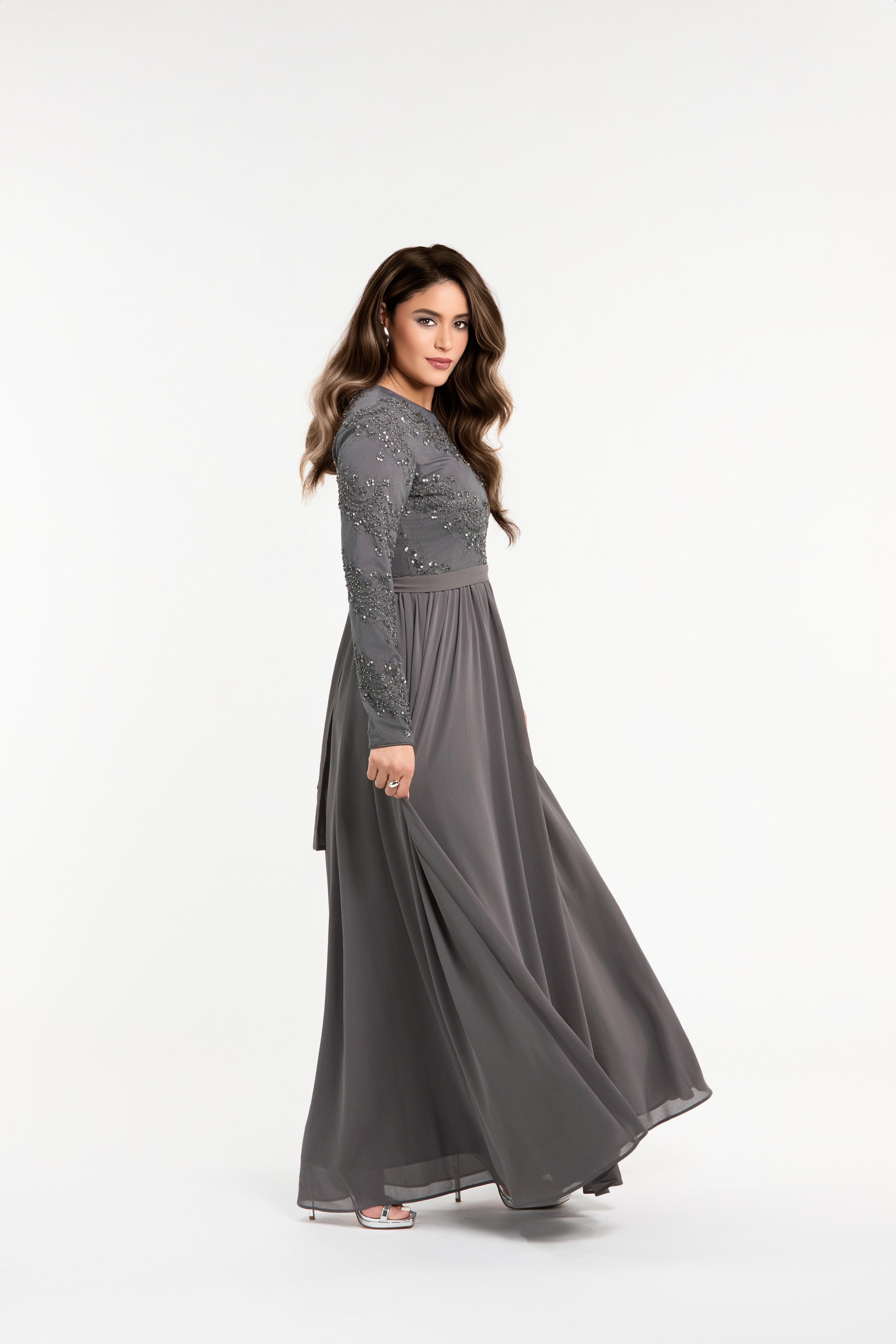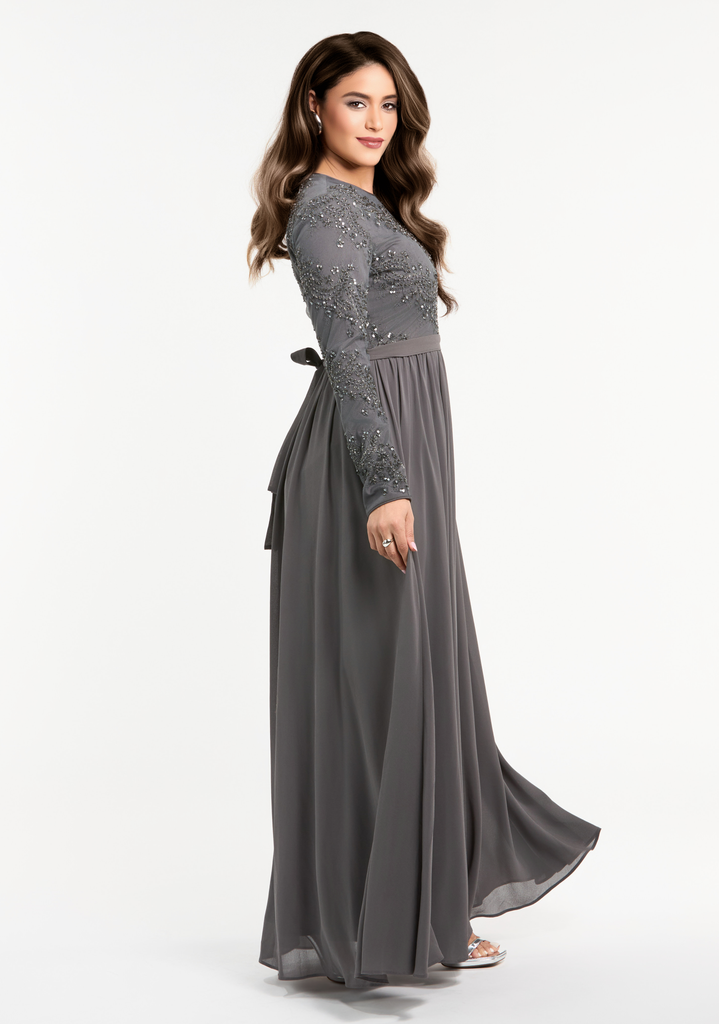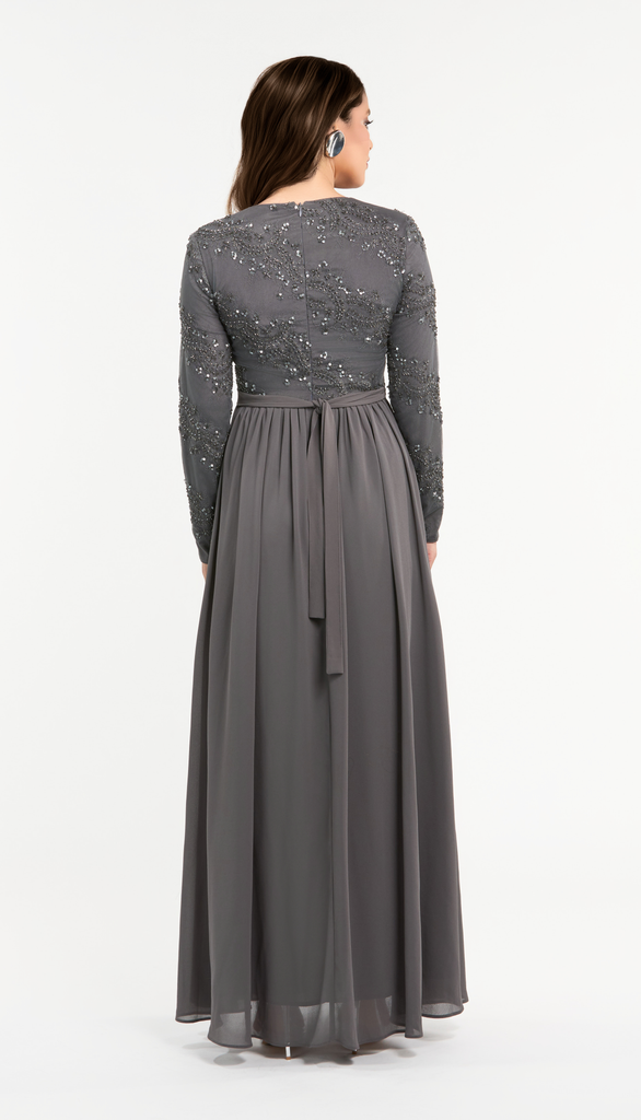 Silver glistening metallic beadwork at the bop of the dress and sleeves.